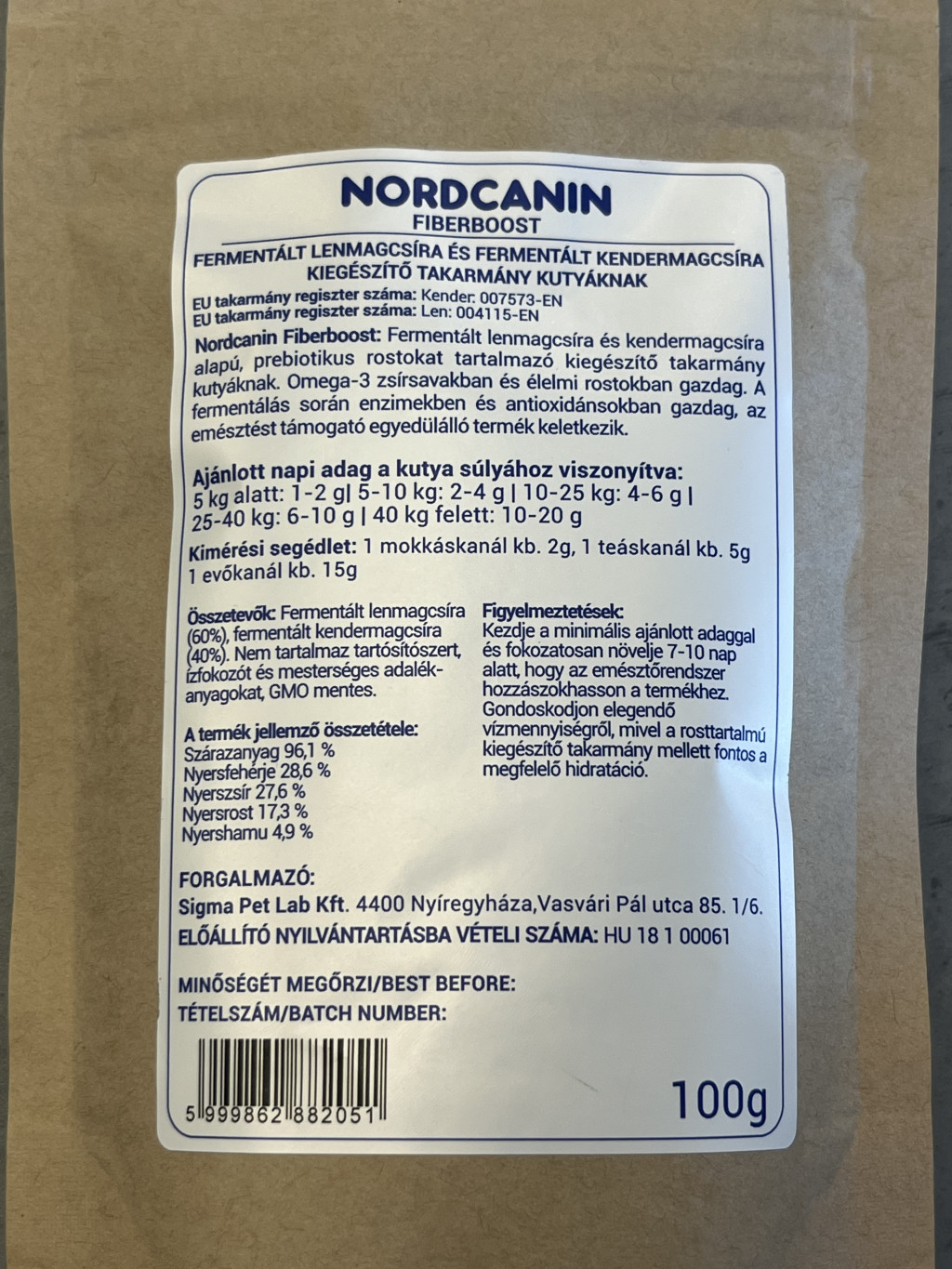 A Nordcanin Fiberboost egy természetes táplálékkiegészítő kutyáknak, amely bio len- és kendermagcsírából készül. Fő célja, hogy javítsa a kutyák emésztését, csökkentse a gyulladásokat, és erősítse az immunrendszert. Gluténmentes, így segít a bélflóra egyensúlyában, csökkenti a hasmenést, és hozzájárul a szép, fényes szőrzethez. Az Omega-3 zsírsavak és antioxidánsok révén enyhíti az allergiás tüneteket, és segít megelőzni a daganatos betegségeket. Különösen hasznos emésztési problémákkal küzdő, gyenge immunrendszerű vagy allergiás kutyáknak, de bármilyen kutya számára ajánlott. A Nordcanin Fiberboost segít a kutyák vitalitásában és jólétében, hogy hosszabb, egészségesebb életet élhessenek. Ez a termék minden gazdi számára ideális választás, aki a legjobbat szeretné kedvencének.